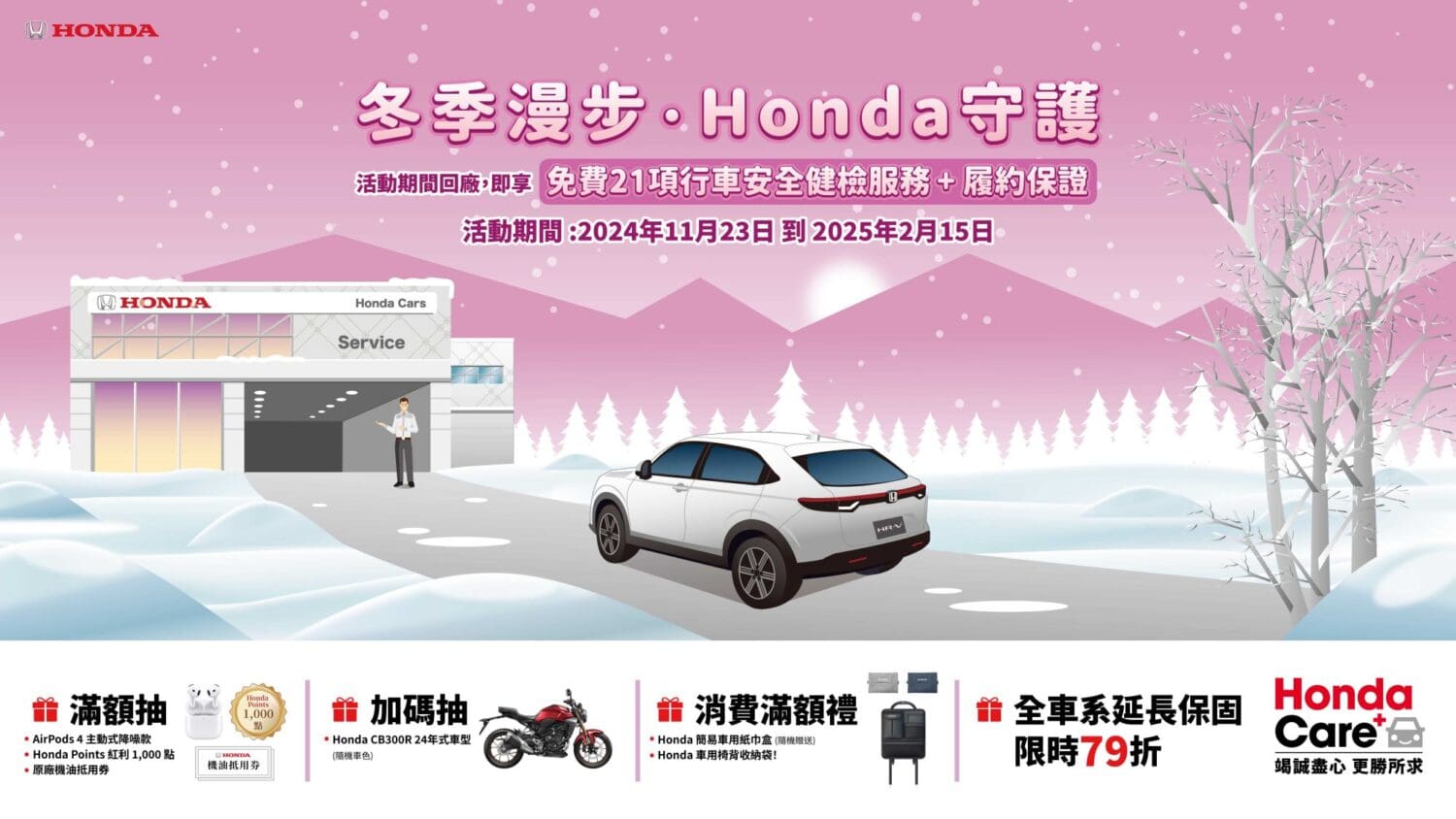 Honda Taiwan自2024年11月23日至2025年2月15日舉辦Honda Care +「冬季漫步,Honda守護」活動。我們誠摯邀請車主預約回廠,即享免費21項行車安全健檢服務+履約保證。