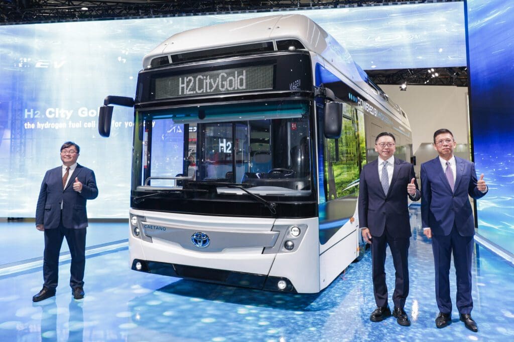 TOYOTA總代理和泰汽車12月28日於《2024台北新車暨新能源車特展》舉辦TOYOTA H2 CITY GOLD預賞會,搶先亮相即將於明年正式上市的TOYOTA低底盤氫能巴士—H2 City Gold。此款車型搭載TOYOTA的氫燃料電池系統,10分鐘即可充滿37.5 kg的氫氣,提供450km的極佳續航力。 H2 City Gold零排放的氫能移動方案 H2 City Gold是TOYOTA與葡萄牙廠商Caetano攜手合作開發,並已在歐洲多個城市運行,包括葡萄牙、西班牙、德國、英國、丹麥等地。車型配備與TOYOTA Mirai相同的氫燃料電池系統, 行駛過程中,除了H2O…